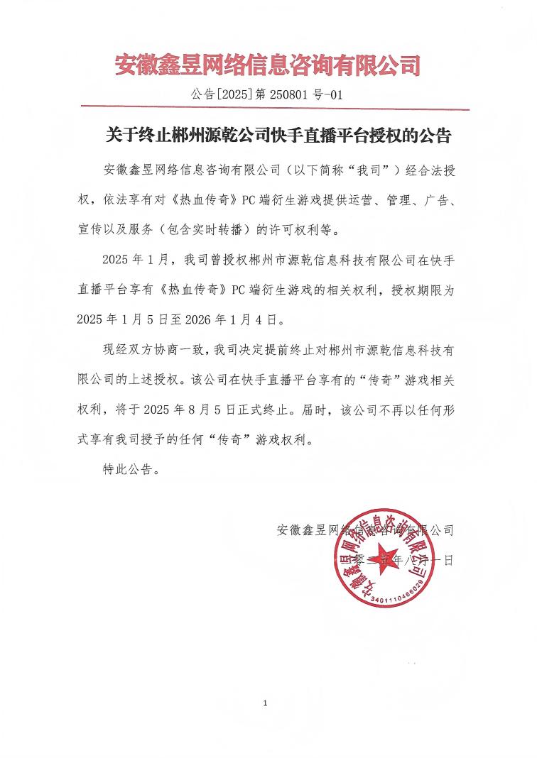 現(xiàn)經(jīng)雙方協(xié)商一致,我司決定提前終止對郴州市源乾信息科技有限公司的上述授權(quán)。該公司在快手直播平臺享有的“傳奇”游戲相關(guān)權(quán)利,將于2025年8月5日正式終止。屆時,該公司不再以任何形式享有我司授予的任何“傳奇”游戲權(quán)利。