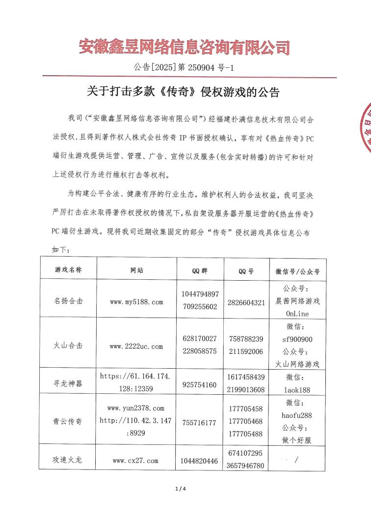 我司(“安徽鑫昱網(wǎng)絡(luò)信息咨詢有限公司”)經(jīng)福建撲滿信息技術(shù)有限公司合法授權(quán),且得到著作權(quán)人株式會(huì)社傳奇IP書(shū)面授權(quán)確認(rèn),享有對(duì)《熱血傳奇》PC端衍生游戲提供運(yùn)營(yíng)、管理、廣告、宣傳以及服務(wù)(包含實(shí)時(shí)轉(zhuǎn)播)的許可和針對(duì)上述侵權(quán)行為進(jìn)行維權(quán)打擊等權(quán)利。
