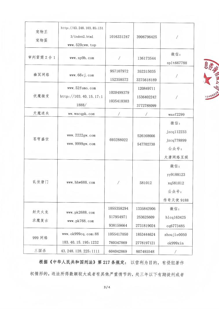 根據(jù)《中華人民共和國(guó)刑法》第217條規(guī)定: 以營(yíng)利為目的,有侵犯著作權(quán)情形的,違法所得數(shù)額較大或者有其他嚴(yán)重情節(jié)的,處三年以下有期徒刑或者拘役,并處或者單處罰金;違法所得數(shù)額巨大或者有其他特別嚴(yán)重情節(jié)的,處三年以上七年以下有期徒刑,并處罰金。上表中的各侵權(quán)私服,我司已完成侵權(quán)固定程序并將依法采取維權(quán)手段,追究侵權(quán)游戲經(jīng)營(yíng)者及為其提供幫助的相關(guān)人員的法律責(zé)任,望相關(guān)侵權(quán)人及時(shí)迷途知返,停止侵權(quán)行為,合法運(yùn)營(yíng)。