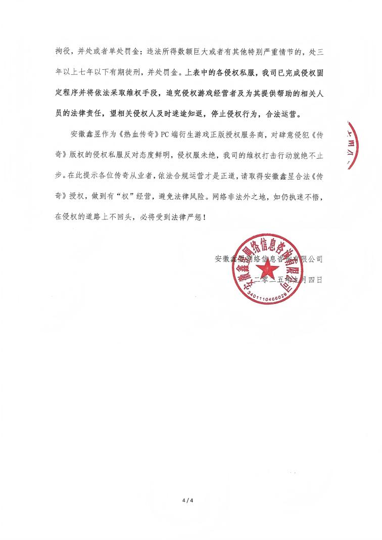 安徽鑫昱作為《熱血傳奇》PC端衍生游戲正版授權(quán)服務(wù)商,對(duì)肆意侵犯《傳奇》版權(quán)的侵權(quán)私服反對(duì)態(tài)度鮮明,侵權(quán)服未絕,我司的維權(quán)打擊行動(dòng)就絕不止步。在此提示各位傳奇從業(yè)者,依法合規(guī)運(yùn)營(yíng)才是正道,請(qǐng)取得安徽鑫昱合法《傳奇》授權(quán),做到有“權(quán)”經(jīng)營(yíng),避免法律風(fēng)險(xiǎn)。網(wǎng)絡(luò)非法外之地,如仍執(zhí)迷不悟,在侵權(quán)的道路上不回頭,必將受到法律嚴(yán)懲!